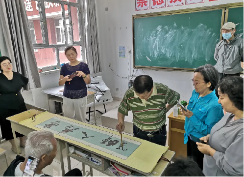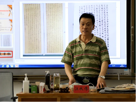 最后,江从伟老师为大家细致讲解如何开笔、润笔、提笔、按笔等技巧。之后江教授还与在场的教职工和离退休教师们进行了互动交流,教职工们提出关于初学书法对笔墨纸张是否有要求、学习书法是否一定要从楷书入门、如何鉴别一幅书法作品的优劣等问题,江教授都做了详细的解答,整场讲座使老师们受益匪浅,对中华传统艺术有了更深刻的理解。