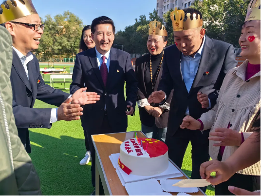 在国旗合影时刻,大家纷纷与国旗同框,拍照纪念。这一环节不仅让大家更加亲近国旗,也增强了大家的爱国情感和民族自豪感。同时,还为当日过生日的师生、居民举行了小型庆祝会,大家齐唱生日歌,共享蛋糕,欢声笑语中增添了节日的欢乐气氛。