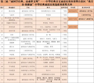 经过两个小时的激烈角逐,最终评出一等奖两组,二等奖四组,三等奖六组,优秀奖六组,以及最佳创意奖、最佳声音奖和最佳台风奖三个单项奖。建筑设备工程学院、工程管理学院、建筑规划与设计学院获得优秀组织奖。优秀选手将代表学院参加“我青春·我健康”中华经典诵读大赛自治区选拔赛。
