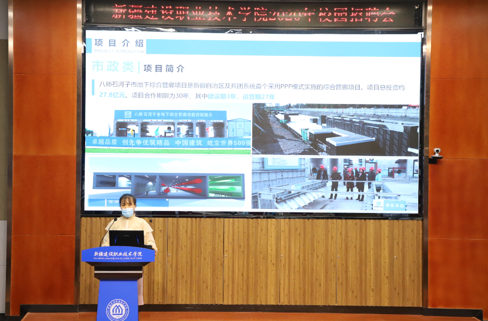 接着,由中建新疆建工国际总承包分公司、中建新疆建工(集团)第一建筑工程有限公司、新疆城建(集团)股份有限公司、中铁十九局第五工程有限公司、乌鲁木齐房地产开发(集团)有限公司、新疆建业建筑安装工程有限公司、新疆建通工程管理有限责任公司、新疆建科智诚工程咨询有限公司、新疆众和股份有限公司9家企业进行宣讲,向同学们介绍公司的概况、组织构成、未来发展方向及人员需求。