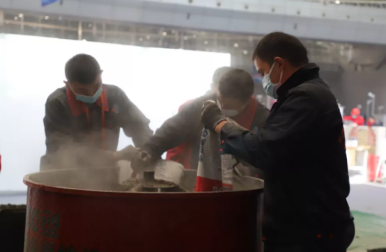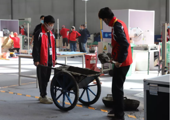 学生志愿者们运送砂浆,高效完成赛务保障工作。