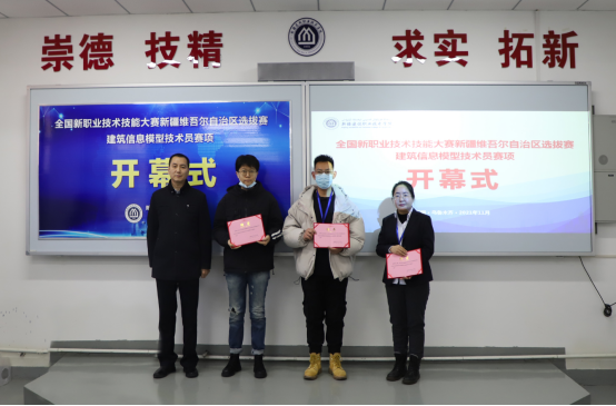 学院党委委员、副院长石建平宣读《关于全国新职业技术技能大赛新疆维吾尔自治区选拔赛建筑信息模型技术员赛项裁判员聘任的决定》,并为裁判员颁发聘书。