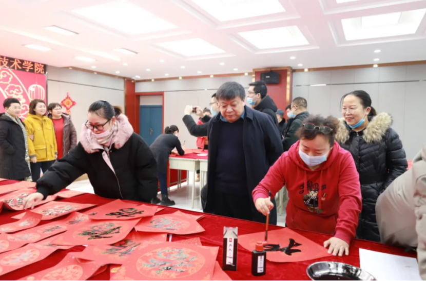 此次活动,吸引了一批在职教师和离退休老同志的热心参与,活动现场热闹非凡,笑声朗朗。整个活动现场红色春联整齐平铺,墨香盈室,还有学院领导为教职工发放的“红包雨”,“福”气连连,气氛祥和。