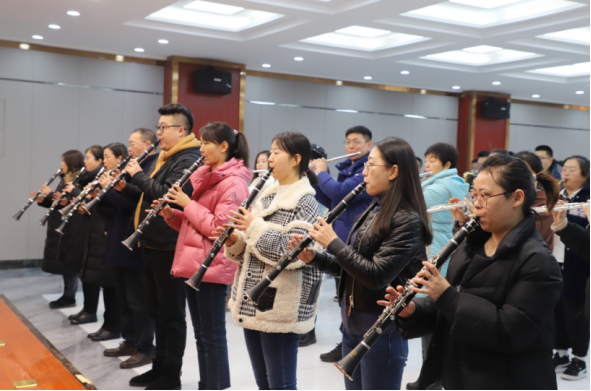 一位老师为了加强练习,早上不到8点就起床了,为了不扰人清梦,她把乐器带到操场上,躲到角落进行长音练习;利用课间十分钟,还不忘再练习下指法。有的老师把乐器带回家练习,邻居跑来敲门,老师连连道歉:“对不住啊,声音是有些刺耳,但为了献礼建党百年必须要加紧练习啊,多多包涵”。为了记住乐谱,有的老师在乐谱上把“do.re.mi”标记成“1.2.3”,办公室里常常听到他用阿拉伯数字“念”乐谱,“没得办法,只能这样死记硬背,啃下这块硬骨头!”排练刚刚结束,一位老师带着哭腔说:“真没想到这个乐器这么难学?我这个什么音乐知识都不懂的小白,手跟不上嘴,嘴跟不上眼,真是手忙脚乱” ……