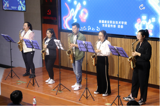 教师管乐团成员带来萨克斯小合奏《美丽的草原我的家》和《走过咖啡屋》