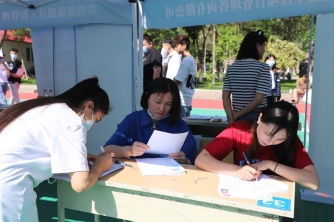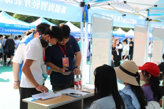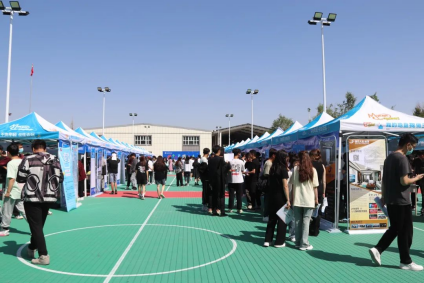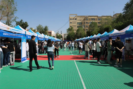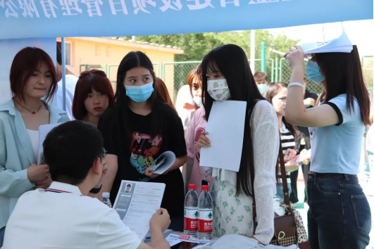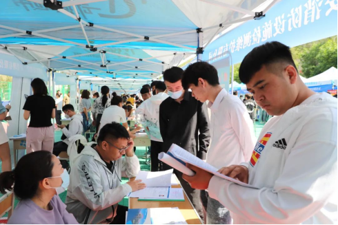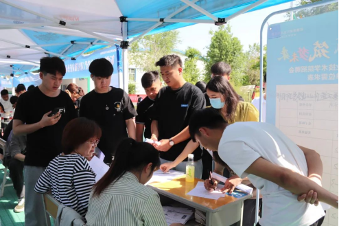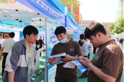 当天阳光明媚,花红草绿,音乐喷泉在“跳舞”,招聘会现场人头攒动,毕业生们拿着精心准备好的简历接踵而至,在各企业展位间穿梭,认真研究企业招聘简章,表达求职意向,并主动向企业展示自己的综合能力。