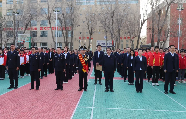 乌鲁木齐市公安局高新区分局银川路派出所民警以及在家院领导和全体师生一起参加升国旗仪式。