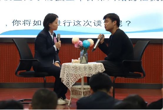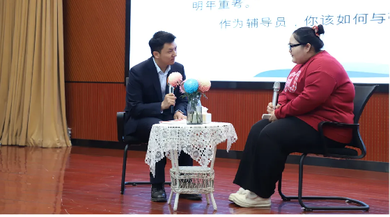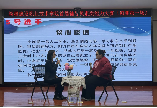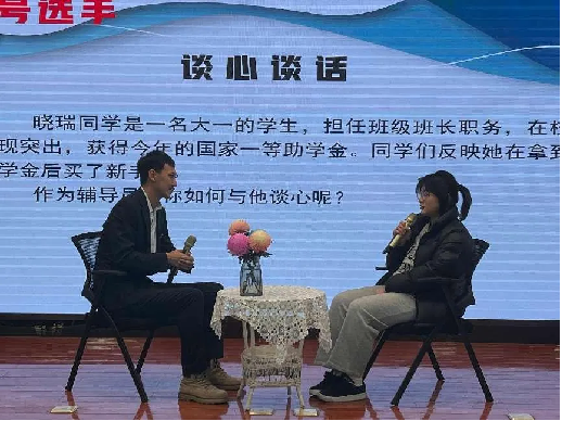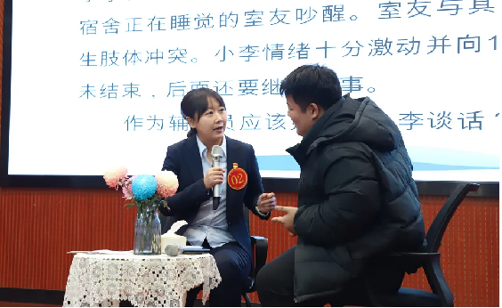 谈心谈话环节,选手抽题匹配助演学生后,以情景再现的方式,现场展示辅导员与学生谈心谈话的场景,谈话围绕人际关系、违规违纪、学业指导、突发事件等方面展开,充分检验辅导员谈心谈话的技巧和思想引领的业务能力。