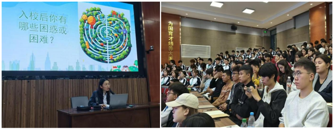 刘滢沁老师以“大学成长从心开始”为主题,聚焦新生“角色转变”,从社会角色、奋斗目标、生活方式、学习方式、交往方式五个维度,剖析新生适应难点,引发师生共鸣。
