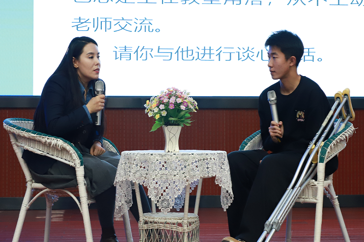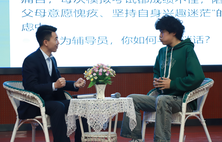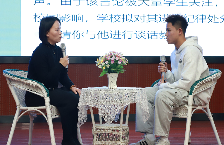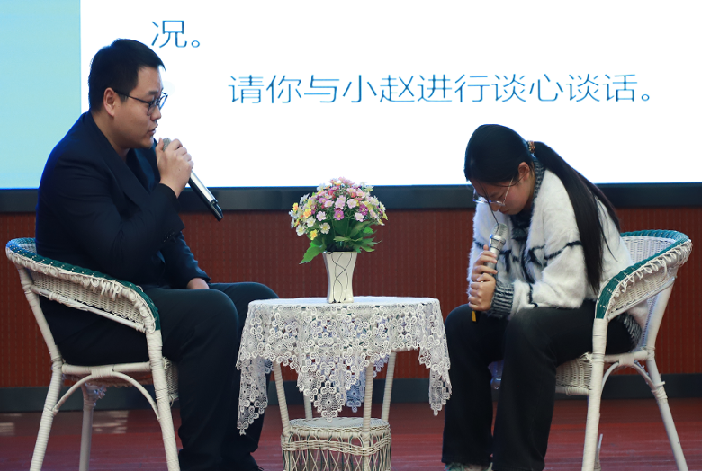 谈心谈话环节以情景再现的形式,生动还原辅导员与学生沟通的真实场景。参赛辅导员全程真诚倾听、耐心疏导,温情关怀,与助演学生沉浸式互动。他们以春风化雨般的话语走进学生内心,精准解惑,尽显育人初心。