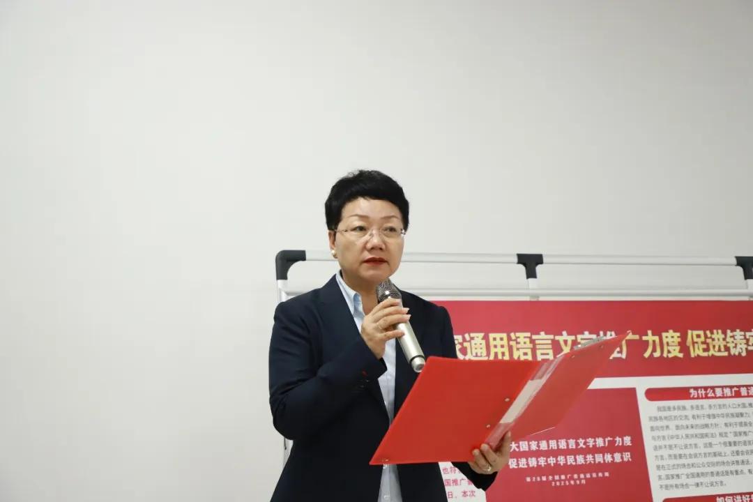 学院党委委员、副院长马桂珍首先发表讲话。她强调,大力推广和规范使用国家通用语言文字,是关系国家统一、民族团结、经济发展、文化复兴和社会进步的基础性工程。它有利于消除语言隔阂,促进社会交往,更为重要的是,它是铸牢中华民族共同体意识的重要途径。一口标准的普通话,传递的是共同的乡音与国情,构建的是共有的精神家园,能够极大地增强全体中华儿女的文化认同和民族凝聚力,让“中华民族一家亲,同心共筑中国梦”的理念更加深入人心。