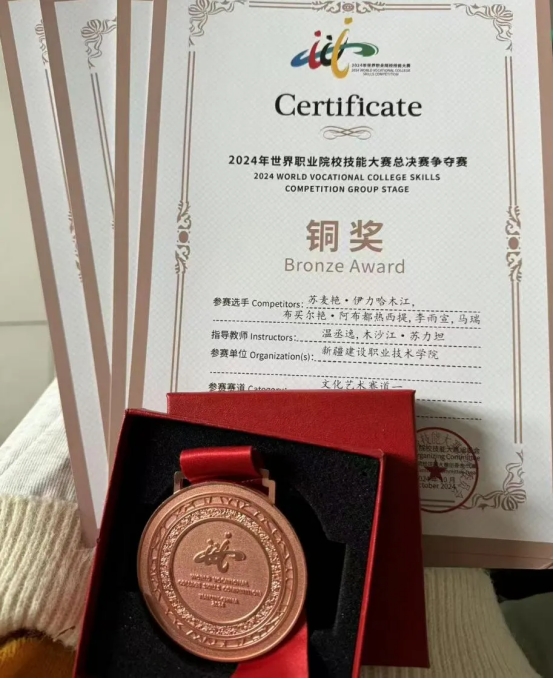 2024年世界职业院校技能大赛总决赛争夺赛在云南省安宁市举办,比赛前,四位来自新疆的姑娘引起众人的围观和瞩目,她们头上戴着新疆维吾尔族特色的小花帽,队长苏麦艳·伊力哈木江身着艾德莱斯纹样的长裙,迈着坚定的步伐带着梦想和期盼步入比赛场地,经过激烈的比赛为自治区获得本赛赛项唯一的奖牌。